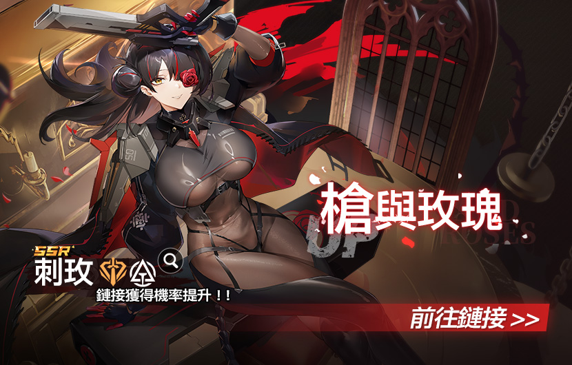 本次「槍與玫瑰」UP鏈接中,SSR「刺玫」將會登場,且出現機率提升!